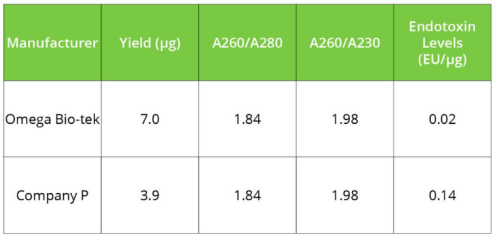按照說明書操作步驟,使用磁珠法無內(nèi)毒素質(zhì)粒小量提取試劑盒以及競品公司試劑盒,從1.5mL DH5α培養(yǎng)基n=3)中提取pGEM質(zhì)粒DNA。使用Thermo Scientific的NanoDropTM 2000c分光光度計(jì)提取的質(zhì)粒DNA進(jìn)行測定Omega Bio-tek試劑盒提取的質(zhì)粒內(nèi)毒素(<0.1 EU/μg)水平更低,產(chǎn)量也高于競品公司。
