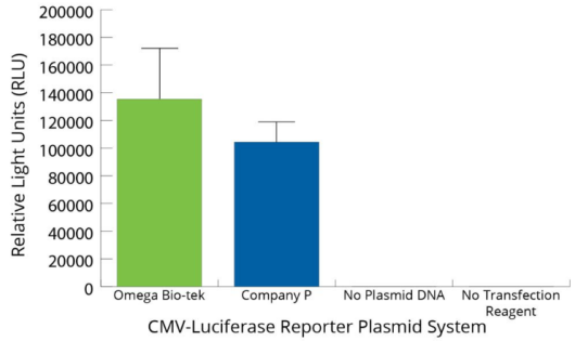 1.5mL DH5α培養(yǎng)基(n=3)制備pGEM質(zhì)粒,并使用磁珠法無內(nèi)毒素質(zhì)粒小量提取試劑盒以及競品公司的等效試劑盒進(jìn)行提取。使用2μL Lipofectamine轉(zhuǎn)染試劑,將200ng純化好的質(zhì)粒轉(zhuǎn)染到10,000個(gè)細(xì)胞中。使用Omega Bio-tek試劑盒純化的質(zhì)粒產(chǎn)生更高的生物發(fā)光信號,與競品公司相比轉(zhuǎn)染效率更高。