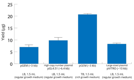 高產(chǎn)量–可從≤1.5mL TB培養(yǎng)基中獲得高達(dá)20μg的質(zhì)粒DNA