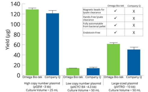 按照說明書操作步驟,使用磁珠法無內毒素質粒中型試劑盒以及競品公司的試劑盒,從DH5α培養(yǎng)基(n=3)中提取不同類型和大小的質粒。使用Thermo Scientific 的NanoDrop™ 2000c分光光度計對提取的質粒DNA進行測定。所有質粒產量均具有可比性,上圖顯示Omega Bio-tek試劑盒優(yōu)于競品公司試劑盒。