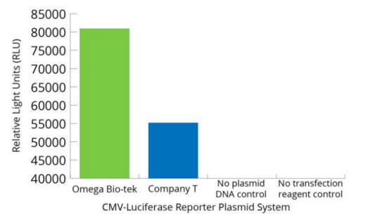 從5mL DH5α培養(yǎng)基(n=3)制備質粒pGL4.51,并使用MagBinder® Fit24核酸提取儀上的磁珠法質粒中量提取試劑盒與競品公司的等效試劑盒進行提取。使用2μL Lipofectamine轉染試劑,將200ng提取好的質粒轉染到10,000個細胞中。使用Omega Bio-tek試劑盒提取的質粒生物發(fā)光信號更高,與競品公司相比,轉染效率更高。