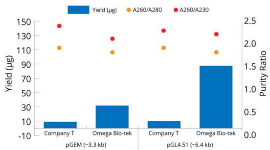 在MagBinder® Fit24核酸提取儀上,使用磁珠法無內毒素質粒中量提取試劑盒以及競品公司試劑盒,按照說明書操作步驟,從5mL DH5α培養(yǎng)基(n=3)中純化pGEM和pGL4.51質粒。使用Thermo Scientific 的NanoDrop™ 2000c分光光度計對純化的質粒DNA進行測定。Omega Bio-tek試劑盒的質粒純化不僅不含內毒素(<0.1 EU/μg),而且與競品公司的試劑盒相比,產量也顯著更高。